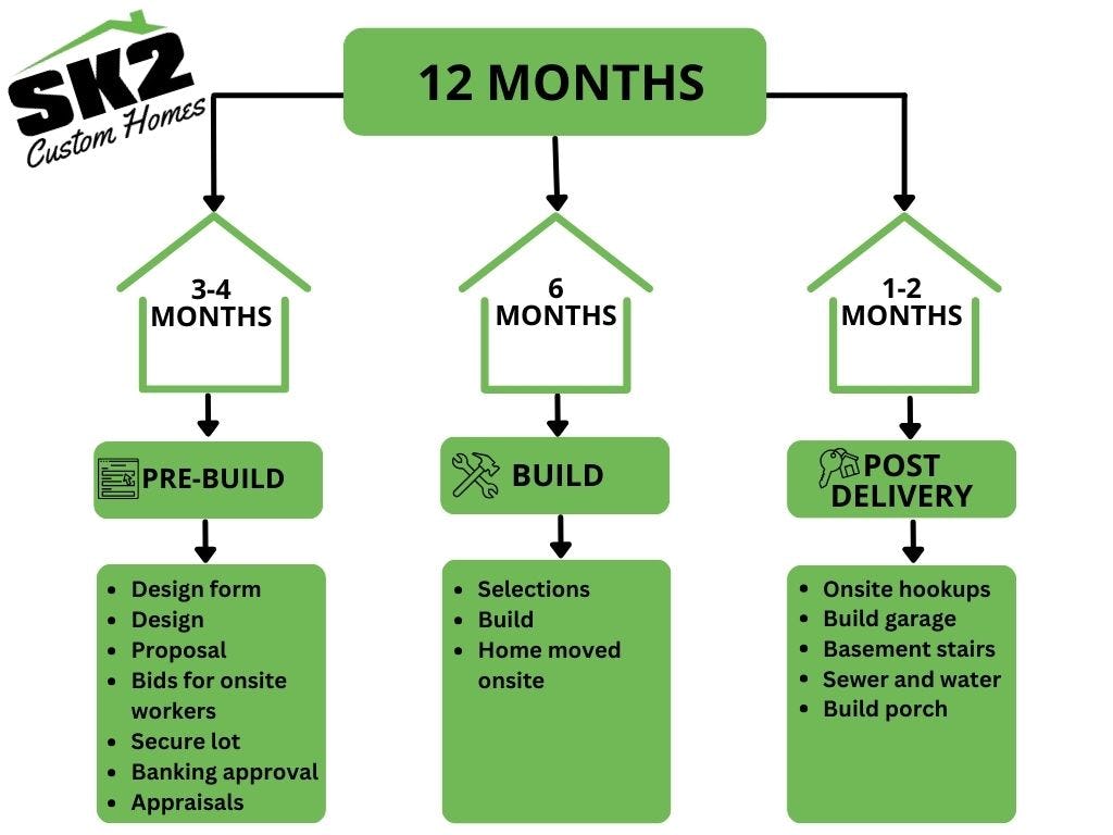 From framing to delivery, It will take us approximately 6 months to complete your home. During these 6 months you will work with our team to make finish selections, you will receive photo and video updates, and you will have the opportunity to make appointments to tour your home on our build site.