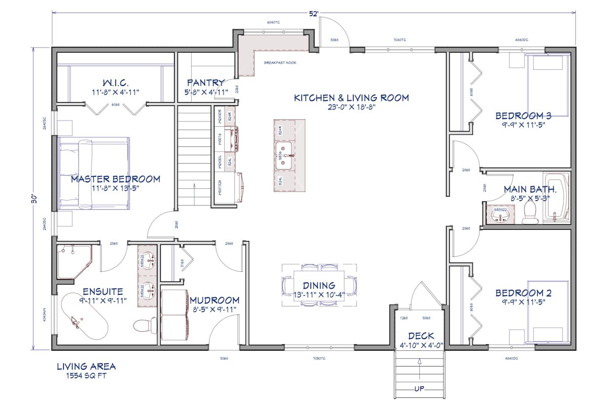We worked with the Michaelson’s to create a floor plan that was conducive to their unique work schedules. With one family member working nights, having a master bedroom and ensuite that was tucked away from the rest of the household was very important. The layout we designed together allowed for the rest of the household to function, while not disturbing any sleep schedules!